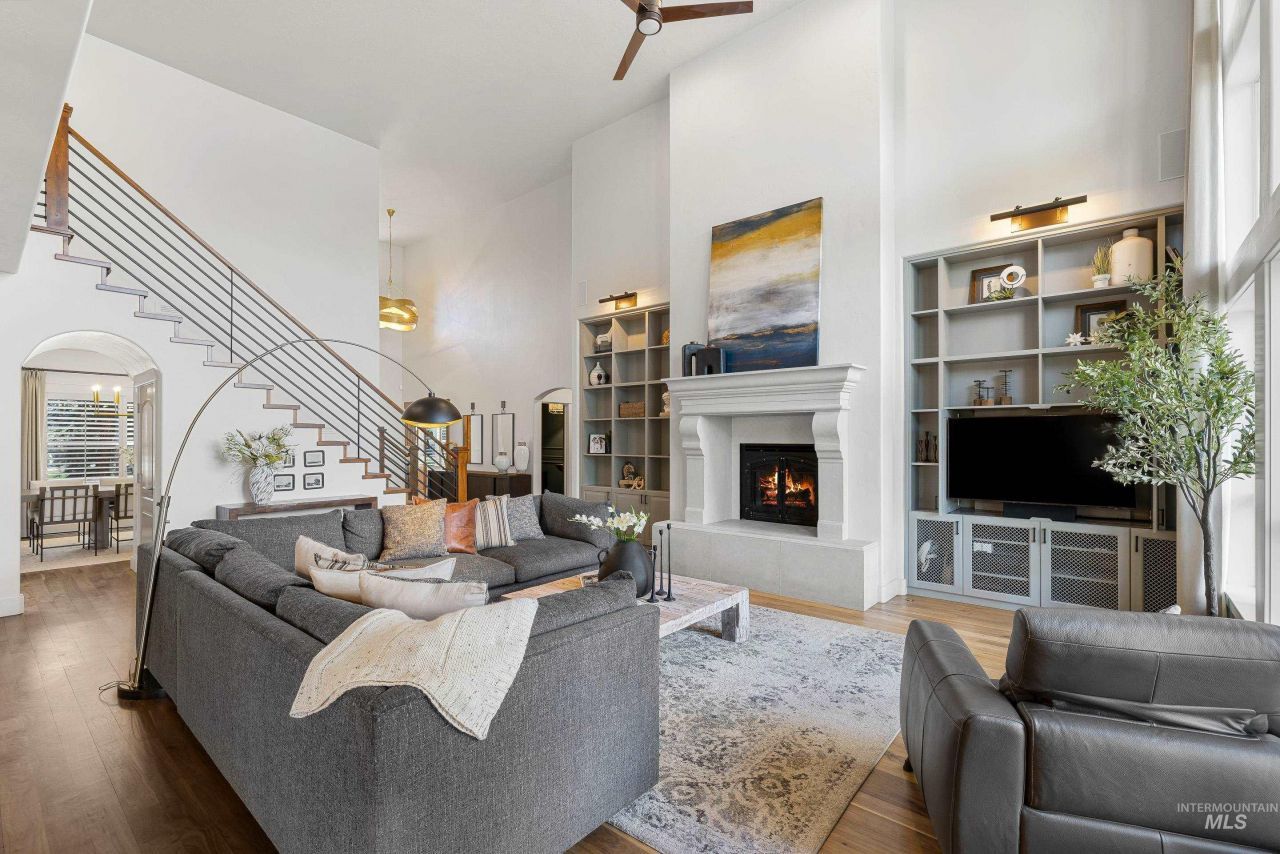 Experience elevated waterfront living in the heart of Eagle. This fully remodeled luxury home blends refined design with effortless indoor?outdoor living, all set against tranquil water views. Inside, the stunning gourmet kitchen is designed to impress, featuring premium Wolf appliances, double ovens, a built-in refrigerator, and a spacious island complete with a secondary prep sink. The kitchen flows seamlessly into the dramatic living room, where a floor-to-ceiling stone fireplace is flanked by custom built-ins and expansive windows framing the serene waterfront backdrop. For hosting and special gatherings, the large formal dining room includes a stylish built-in bar area, creating the perfect space for entertaining. The luxurious main-level primary suite offers a spa-like retreat with dual vanities, a soaking tub, and a beautifully tiled walk-in shower. Upstairs, youll find 3 spacious bedrooms, each with its own ensuite, along with a large bonus room that provides flexible space for a media room, playroom, or lounge area. Step outside to your private backyard oasis designed for low-maintenance luxury. Enjoy turf landscaping, a sprawling paver patio, & a fully equipped outdoor kitchen. Relax around the built-in gas fire pit perched right on the water, & unwind in the hot tub. Located minutes from the Boise River Greenbelt with easy access to Eagles top restaurants and amenities.