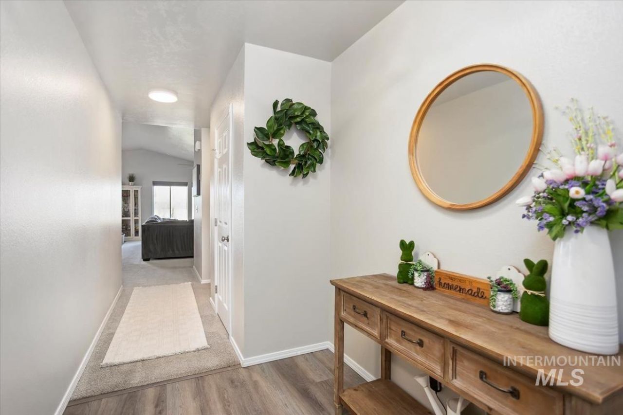 Single-level living with an open layout that actually lives well. The kitchen flows right into the dining and living spaces, and the vaulted ceiling opens everything up so the whole home feels bright, spacious, and easy to enjoy. The kitchen is set up for real life with a center island and breakfast bar perfect for cooking, gathering, or letting people hang out while you finish dinner. The primary suite is tucked away for privacy and features a dual vanity, walk-in shower, and large walk-in closet so you have the space you need to spread out. Out back, youll appreciate no rear neighbors, giving you a little more breathing room and privacy. And at night, youll even catch a peek of the lights from Bogus Basin, a subtle reminder of the Idaho lifestyle everyone loves. Single-level. Open layout. Privacy out back. And a little view to enjoy at night. The kind of home that just feels good the minute you walk in.