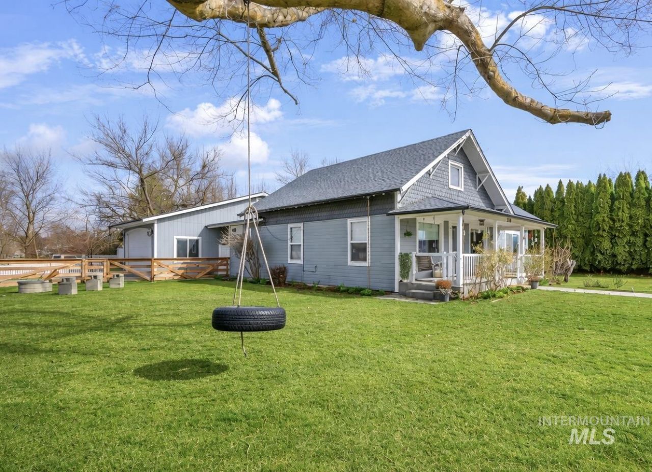 Welcome to this comfortable and charming home. The adorable front porch with built in swings is a perfect gathering space. Step into this three bedroom, two bath on a fully fenced corner lot in New Plymouth with a two car garage and ample parking space. All of this with no HOA or CCRS. The moment you walk through the door, theres warmth here. Natural light pours in from all sides. Large windows in the living room. The kitchen window over the sink, the big picture window in the dining area. Engineered Hardwood floors, white cabinetry, and real brick backsplash. The master bedroom resides on the main level with master bath complete with a tub with full tile surround and custom vanity. The second bedroom which can function as an office. The third bedroom is located upstairs. The home offers a laundry/mud room right off the kitchen. The second full bath with a corner shower is also on the main level. Enjoy the covered patio, garden boxes, fully fenced yard and automatic sprinkler system. Your two car garage has a pull through door, plenty of storage, gym space, and covered storage off the back. This isnt just a house, its home. Will not last long, call for your showing today!