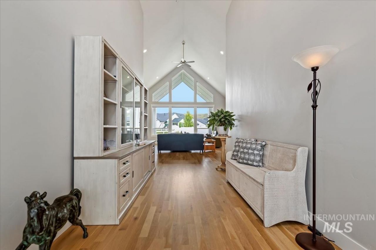 Welcome to Dry Creek Ranch and the Idaho lifestyle that comes with it. Surrounded by foothill views, miles of walking and biking paths, and close proximity to the mountains, this home offers the perfect blend of comfort and recreation.? Inside, a dramatic wall of windows fills the great room with natural light and highlights the open living space. The gourmet kitchen features a Thermador range, floor-to-ceiling cabinetry, quartz and granite countertops, and a large statement island ideal for gathering. Real hardwood floors and artisan tile work add warmth and craftsmanship throughout.? The thoughtfully designed layout includes three bedrooms plus a dedicated office, a luxurious primary retreat with spa-inspired bath, and an extended ?heated garage area with additional shop space.?Situated in a prime location within the community next to a walking path, the home enjoys additional open space and beautiful surrounding views. Dry Creek Ranch offers exceptional amenities including miles of trails, equestrian facilities, and a beautiful community pool.? Experience the best of Idaho living in one of the areas most sought-after communities.